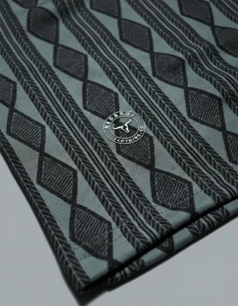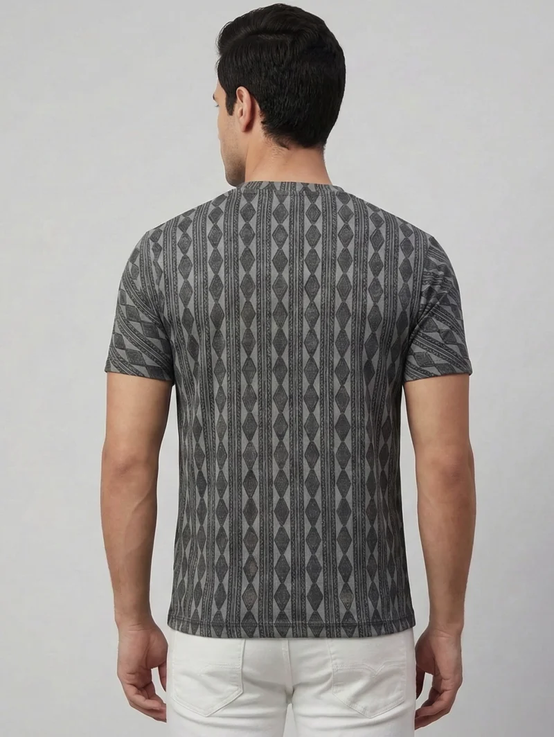 Command attention with our bold grey geometric stripe crew neck t-shirt. This striking design features a structured pattern of vertical lines and interlocking diamonds, creating a sharp, modern silhouette. Crafted from our signature imported Lycra, this tee doesn’t just look highly tailored—it delivers exceptional 4-way stretch and comfort to keep you moving freely all day long.